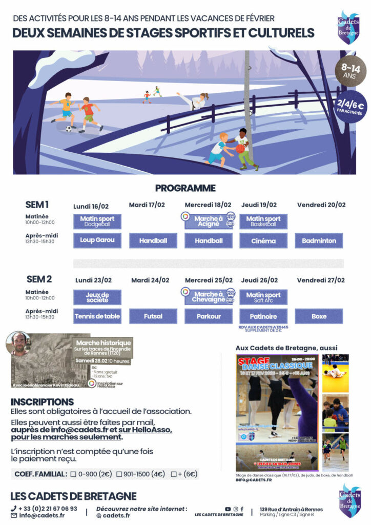 Les inscriptions s’effectuent directement au secrétariat des Cadets de Bretagne. Pensez à amener votre numéro d’allocataire de la Caisse d’allocations familiales (Caf), ou une attestation, pour bénéficier des tarifs réduits à l’inscription.