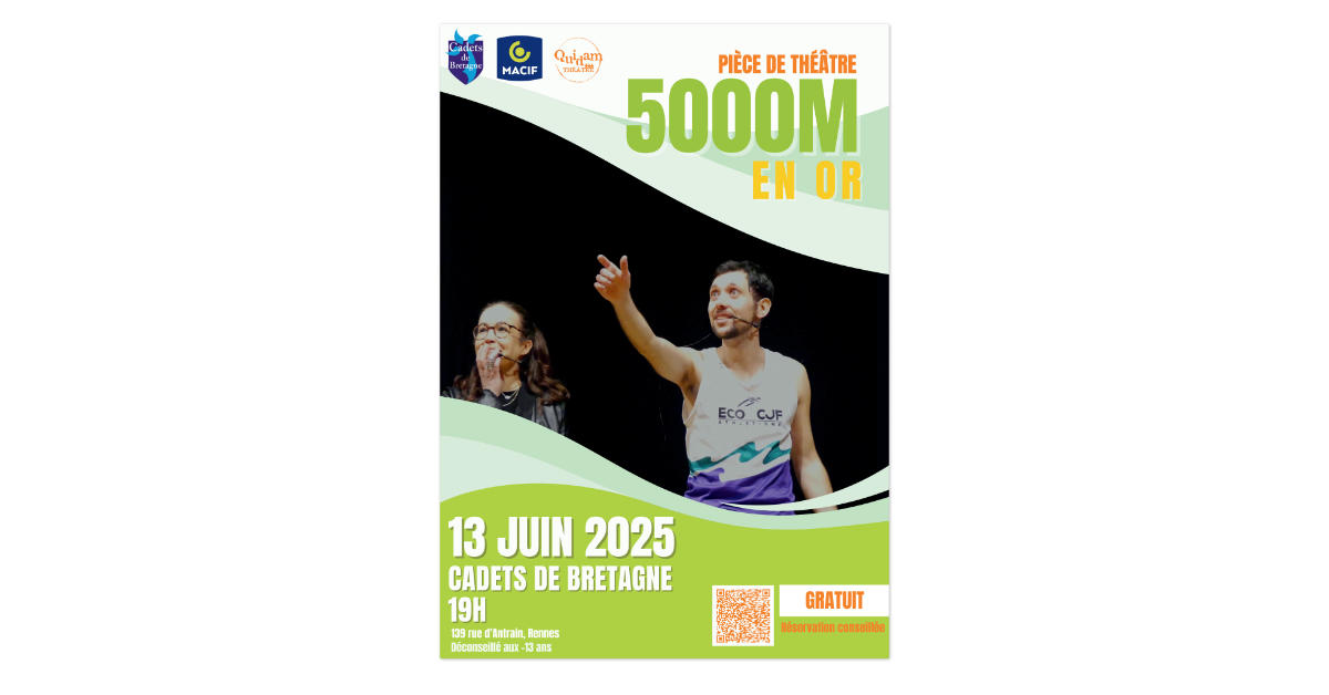 Les Cadets de Bretagne accueillent Quidam-théâtre et son spectacle 5000 mètres en or : une pièce qui aborde le rôle du sport et du handisport pour une reconstruction suite à un accident de la vie. Elle parle aussi, plus globalement, de l’importance du sport pour chacune et chacun d’entre nous. Un échange entre le public et des personnes ressources suivra le temps théâtral.